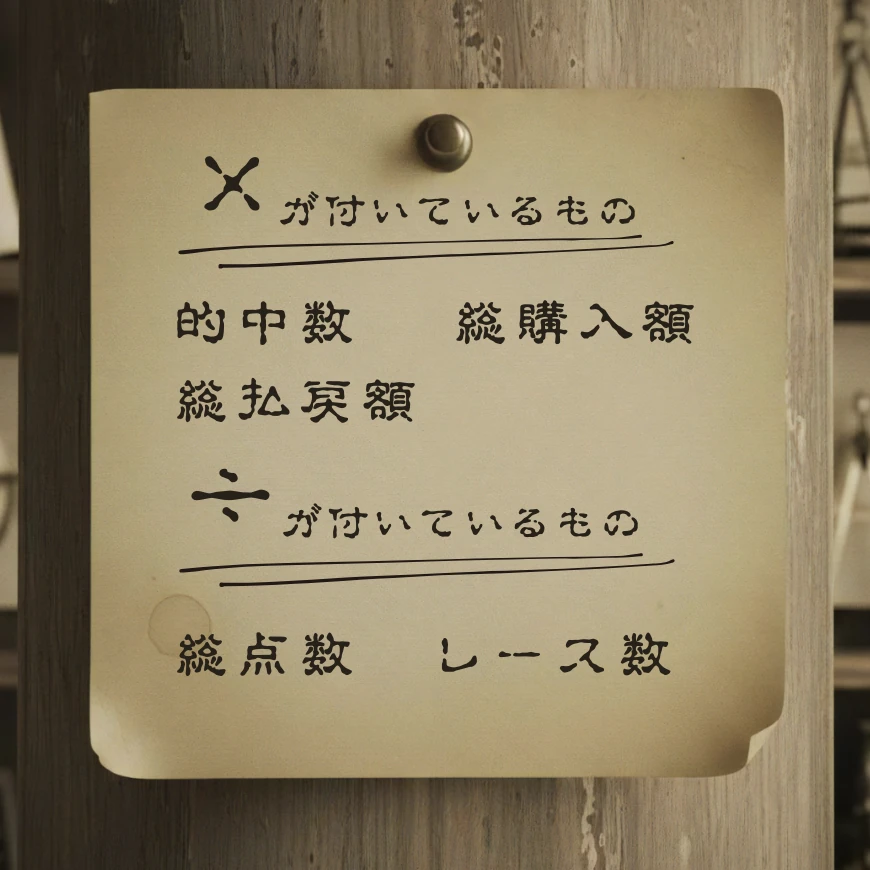 「×」が付いているのは「的中数」「総払戻額」「総購入額」の3つ。