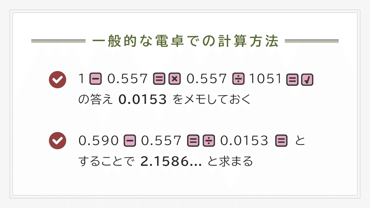 計算に使用するのは、引き算・掛け算・割り算、そしてカッコや平方根(ルート)です。
