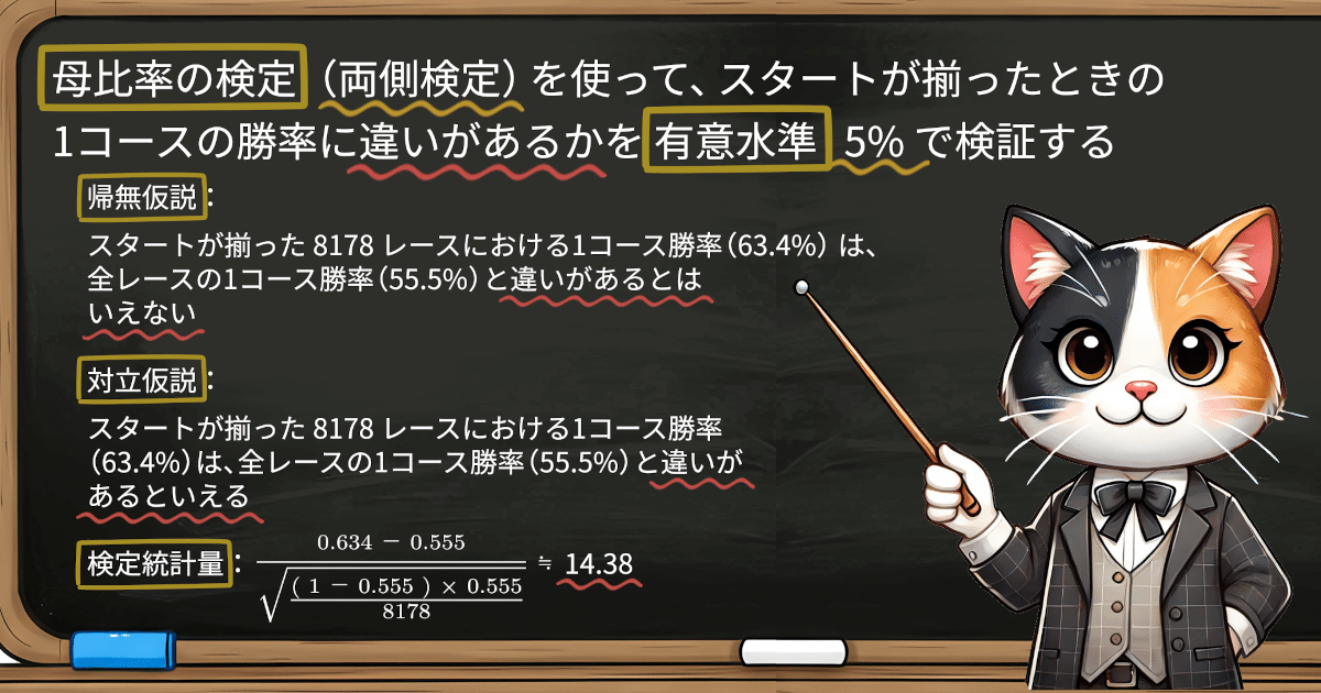 今回、対立仮説には、私たちがそうであると期待する「スタートが揃ったときの1コースの勝率は、全レースの1コースの勝率と違いがあるといえる」としましょう。