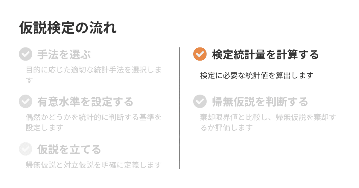 それでは、仮説検定の流れのオレンジ色の項目、「検定統計量を計算する」に進みます。