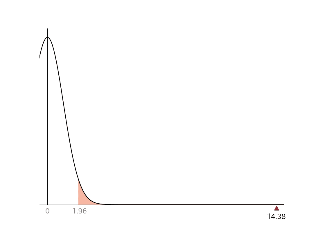 検定統計量の14.38という値は、グラフの白色の部分にはありません。これは統計学が「帰無仮説を棄却した」ということになります。