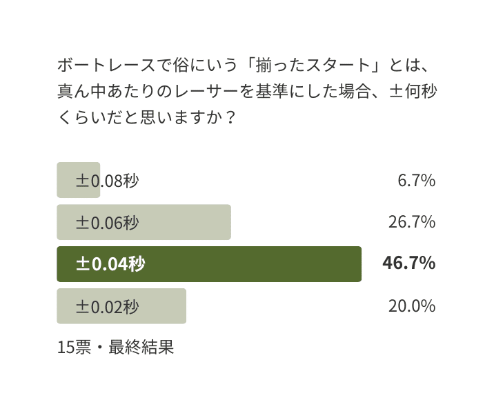 アンケートの結果、スタート時点で中心付近のレーサーから±0.04秒を揃ったスタートと考える人が多かったため、ここではその値を基準とします。