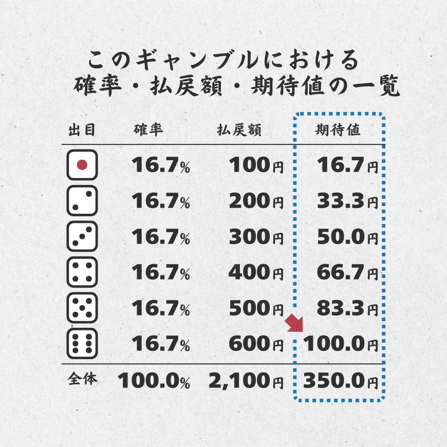 それぞれの出目における「確率」「払戻額」「期待値」を一覧にしたものです。