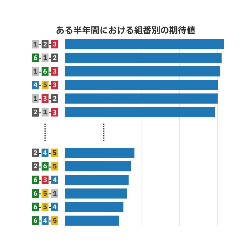それぞれの組番の期待値を求めることで、次のことが見えてきます。