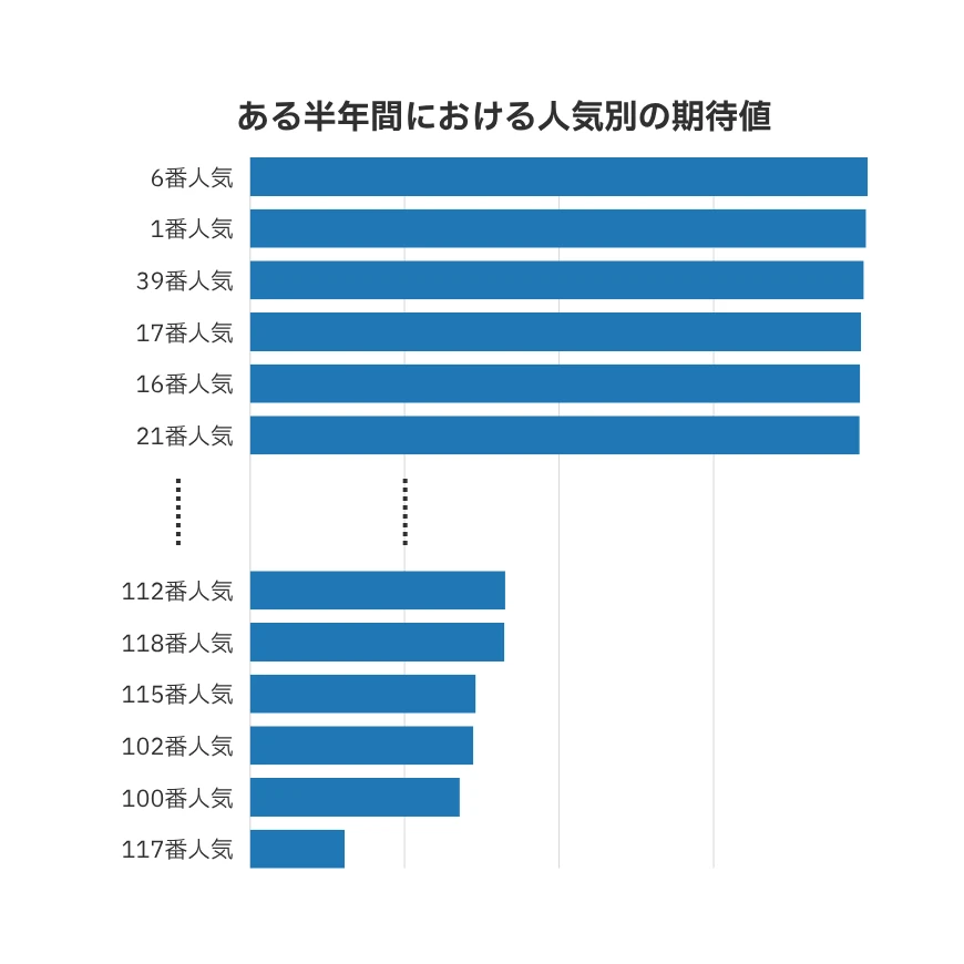 上位はどれも僅差でしたが、もっとも期待値が高かったのは6番人気。続いて1番人気、39番人気、17番人気──と並んでいます。