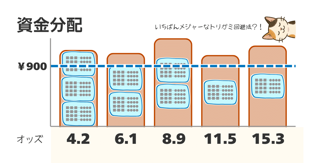 トリガミを避けようとすると、オッズの低い買い目から順に金額を吊り上げて投票することになるのは皆さんもお分かりでしょう。