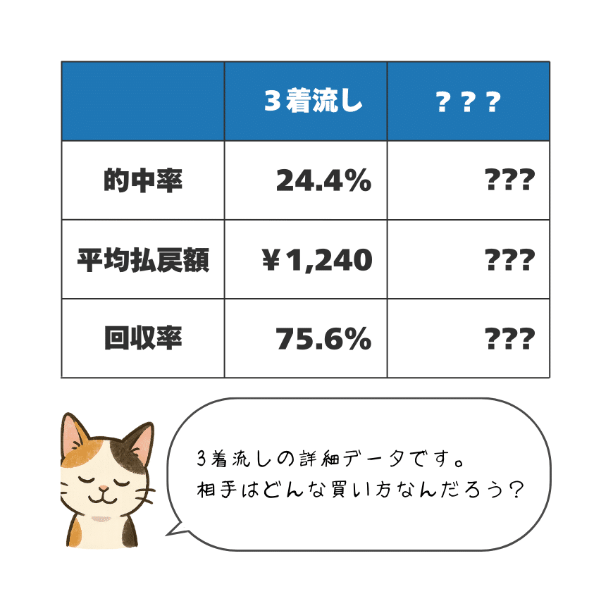 「もし3着を流していたら──」「もし今とは別のパターンで買っていたら──」など、ご自身のデータをご自身で分析してみてください。そこから改善策がきっと見えてきます。