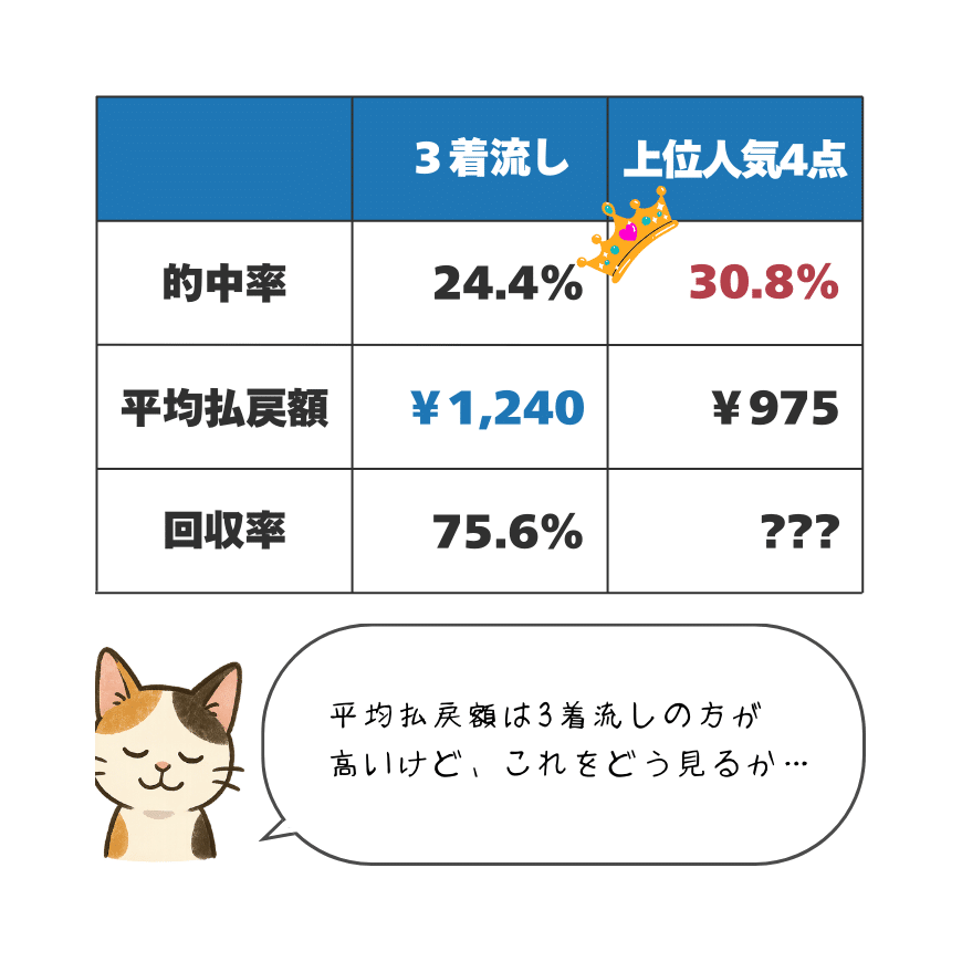 的中率では上位人気4点の方が上回っていた一方、平均払戻額は3着流しを下回っていました。