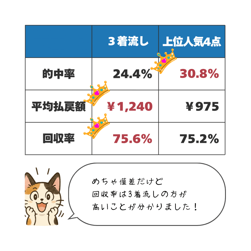 3着流しの回収率が75.6%だったことに対して、上位人気4点の回収率は75.2%と、僅差ではありますが、3着流しの回収率が上回りました。