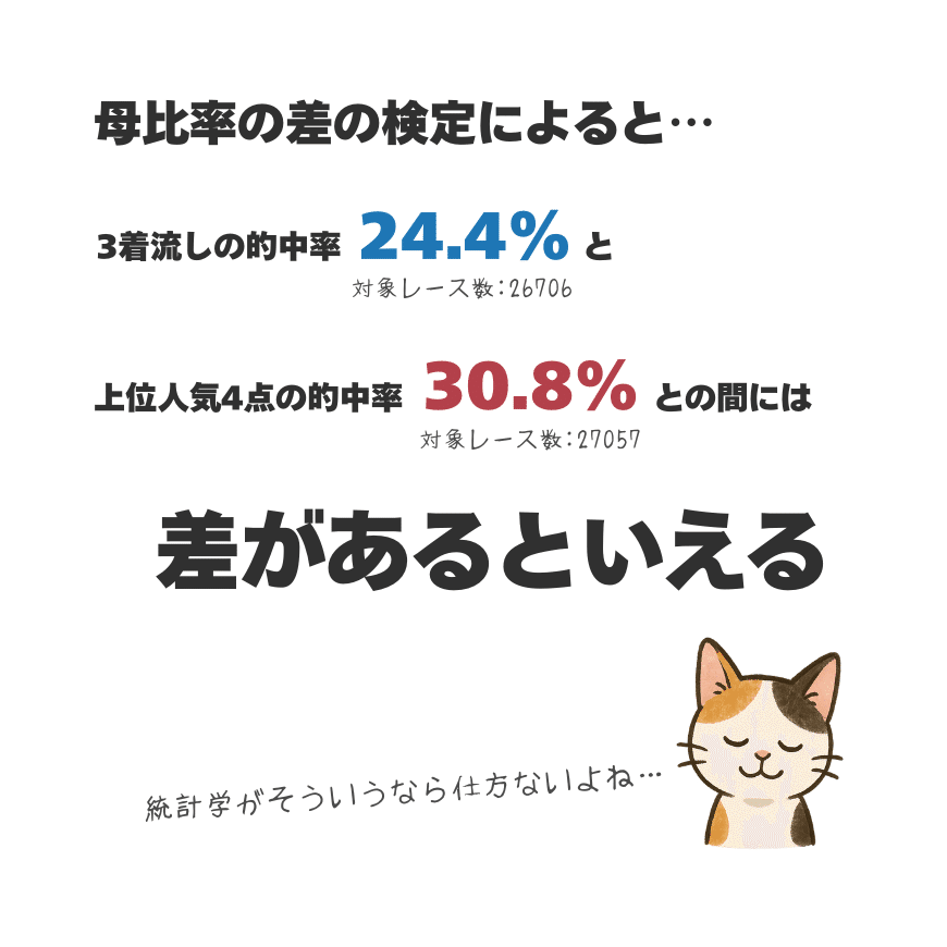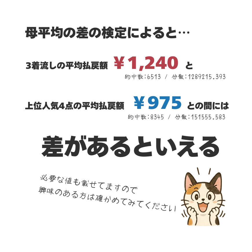 この検定で検証したところ、1,240円と975円の間には差があると判断され、平均払戻額については、上位人気4点より3着流しの方が高いことが分かりました。