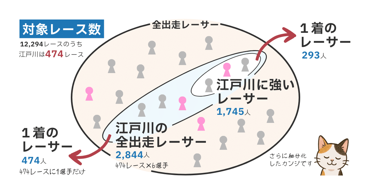 この期間に、江戸川で出走した2,844人のうち、全国勝率より当地勝率の方が高い「江戸川に強い」レーサーが1,745人でした。これが「調べた数」にあたります。