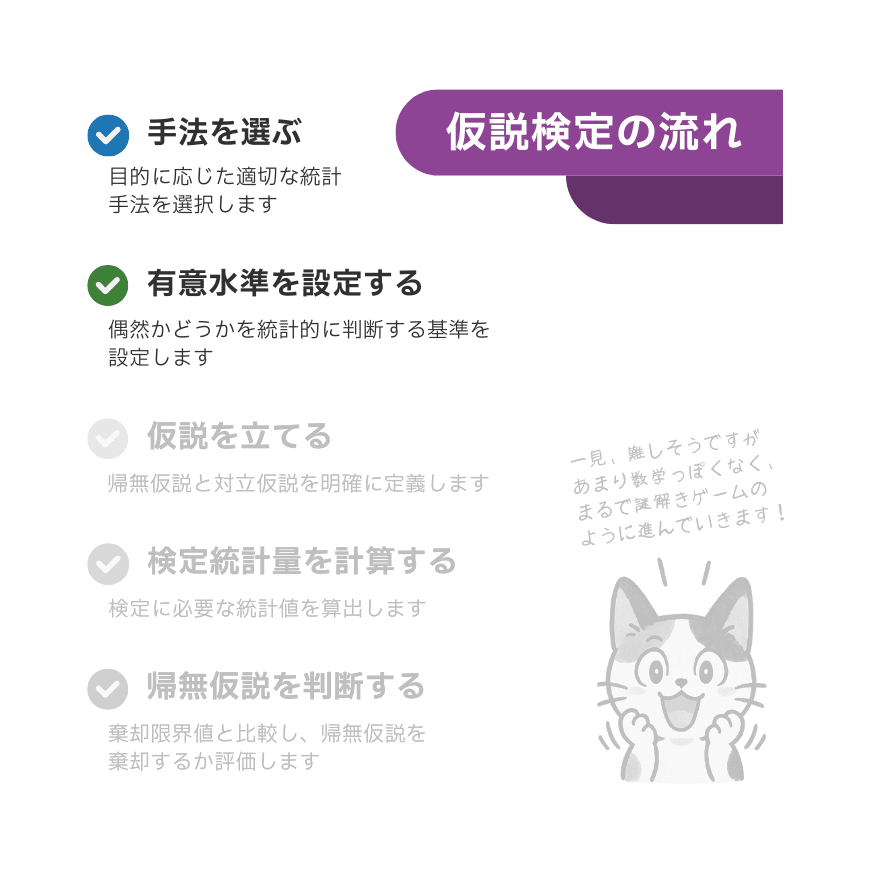 このあと、帰無仮説を前提に検定統計量を算出し、その値で判断することになります。
