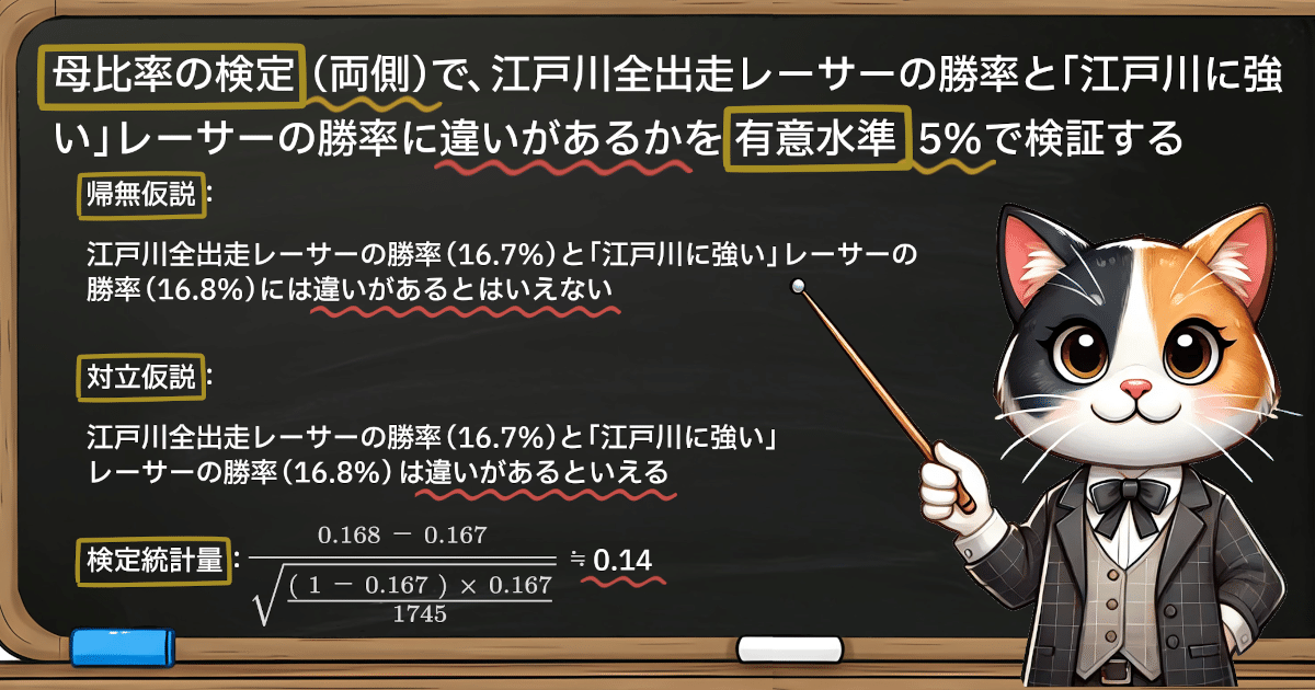 今回だと「江戸川に強いレーサーの勝率と、江戸川に出走した全レーサーの勝率には違いがあるといえる」とします。